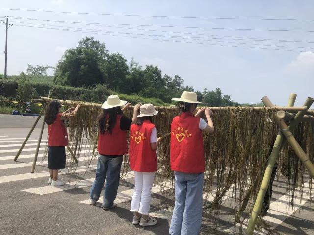 五月的乌木大地上,处处呈现出一片丰收的景象,风山村集体经济种植的金黄色油菜收割现场,志愿者身着红马甲、手持镰刀、脸颊通红,正沿着田边挨株收割油菜,看着身后已收割成堆的油菜秸秆,志愿者乐在脸上,老百姓喜在心中。顶着烈日,志愿者来到凤山村苎麻晾晒场地,虚心向群众请教苎麻晾晒方法和细节,志愿者分工协作,有的把刚从机器里剥出来的湿麻拿到竹竿上分散晾晒,有的将已经晒过脱水的苎麻进行翻晒,不一会,一排一排的竹竿上就挂满了鲜黄的粗加工的麻绳。