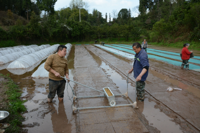 来到妈妈镇永丰村,一群庄稼人正在田里忙活着,铺无纺布、摆盘、搀泥、覆泥、消毒、撒种、覆种、盖膜……,大家分工明确,育秧各项工序正有条不紊地进行着……