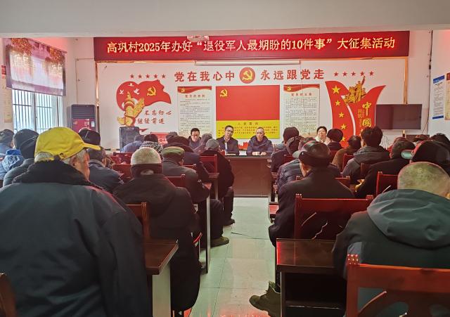 会上,县退役军人局党组书记、局长孙国同志作动员讲话,要求高巩村“两委”班子及镇、村两级退役军人服务站工作人员要明确目标、压实责任,全覆盖收集全村90余名退役军人和其他优抚对象意见和建议,认真梳理征集内容,分类汇总,找准退役军人和其他优抚对象最关切关注、最期盼的事项,扎实推进2025年度“退役军人最期盼的10件事”活动。同时,希望在场退役军人坚决服从党的领导,增强大局意识,为当地经济发展、社会稳定继续做出努力,争做文明守法模范公民。随后,孙国同志现场操作演示,指导在场退役军人通过识别征集二维码提出“最期盼”事项意见。最后,孙国同志及高巩村“两委”干部一同慰问了参会老兵,为其发放了新春挂历和慰问物资,并祝愿他们身体健康,吉祥美满!