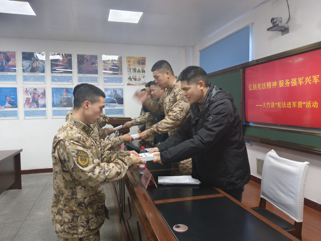 为深入弘扬宪法精神,服务强军兴军目标,增强部队官兵及退役军人的法治观念,切实维护其合法权益,2025年12月5日上午10时,由县退役军人事务局与县人武部联合举办的“宪法进军营”活动在武警大竹中队驻地隆重举行。此次活动以“弘扬宪法精神,服务强军兴军”为主题,旨在军营内外营造尊崇宪法、学习法律、遵守法律、运用法律的良好氛围,进一步巩固和发展军政军民团结。