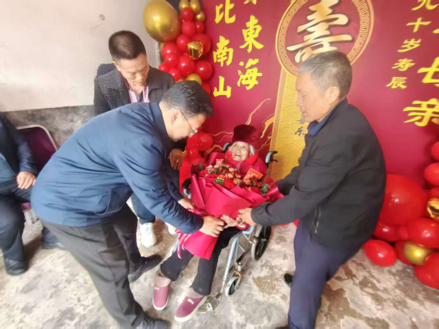祝福环节暖意融融。王明清为胡秀伯老妈妈披上鲜艳的红围巾,并送上慰问金,岳华等献上芬芳的鲜花和寿联,共同转达党和政府的殷切关怀。红围巾象征着英雄血脉的荣光,鲜花承载着后辈的敬意,这份来自市、县两级的共同关怀,凝聚着对英雄母亲的深情厚谊。