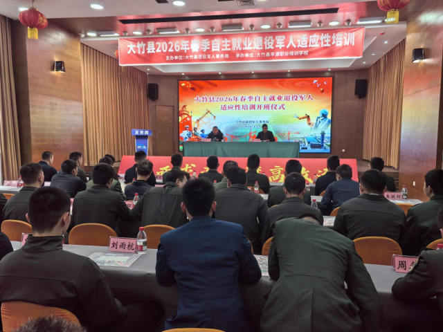 3月23日,大竹县2026年春季自主就业退役军人适应性培训开班仪式在大竹县丰源职业培训学校隆重举行。107名光荣返乡的退役军人齐聚一堂,满怀信心地开启了融入社会、扬帆新程的第一课。大竹县退役军人事务局党组成员、副局长赵苑植出席仪式并讲话,安置就业股邓华主持仪式。