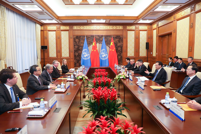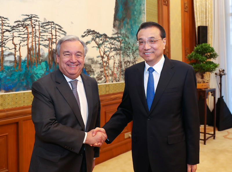 当天下午,李克强总理在北京钓鱼台国宾馆会见来华进行正式访问的联合国秘书长古特雷斯。李克强强调,作为世界最大的发展中国家,中国愿意承担与自身实力相符的国际责任,与国际社会一道共同支持贸易和投资自由化便利化,坚决反对贸易保护主义,推动经济全球化向更加开放、包容、普惠、平衡、共赢的方向发展,为人类进步作出积极贡献。