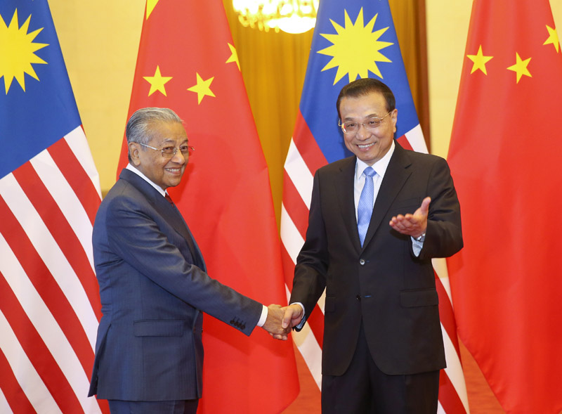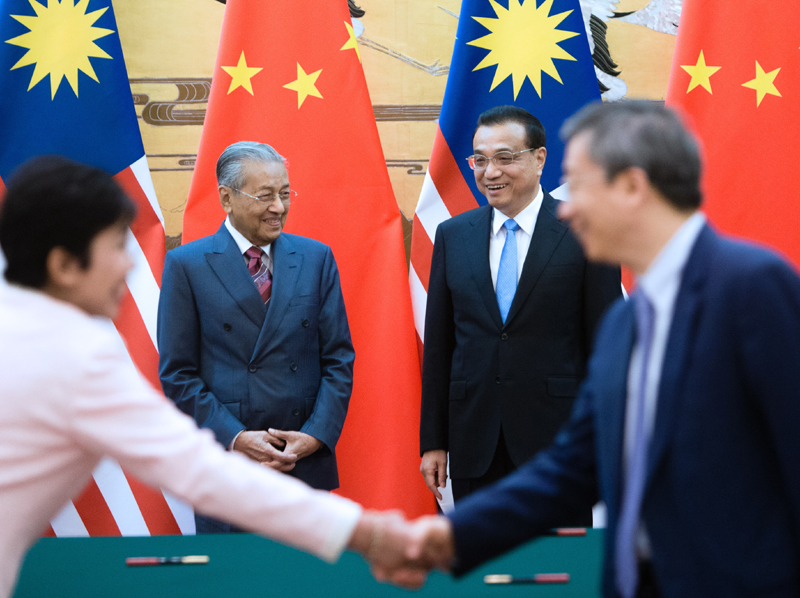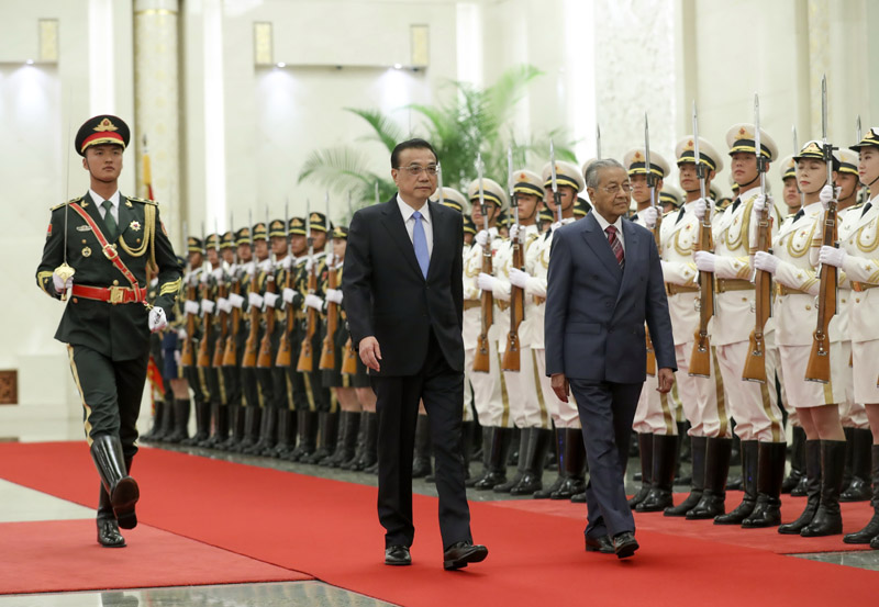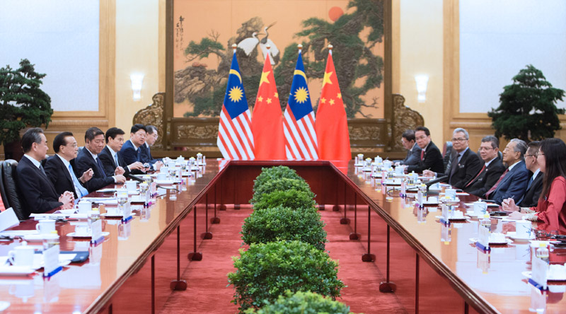 国务院总理李克强8月20日上午在人民大会堂同来华进行正式访问的马来西亚总理马哈蒂尔举行会谈。