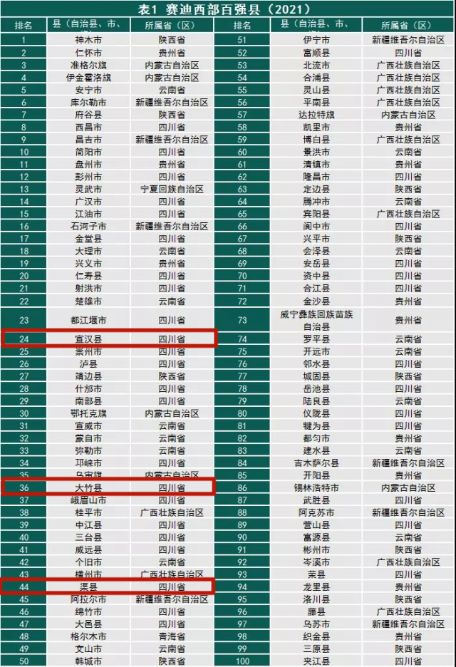 近日,国家工信部下属研究机构“赛迪顾问”县域经济研究中心发布《2021年中国西部百强县排行榜》,达州共有3个县上榜,其中宣汉县列24位,大竹县列36位,渠县列44位。据了解,大竹县继2018年首次入选后,连续第四年上榜。