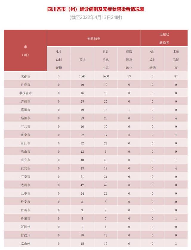 4月13日0时至24时,四川无新增本土确诊病例,无新增本土无症状感染者,新增境外输入确诊病例5例(均在成都市,其中2例为既往通报的无症状感染者转确诊),新增境外输入无症状感染者3例(均在成都市),新增治愈出院病例9例,无新增疑似病例,无新增死亡病例。