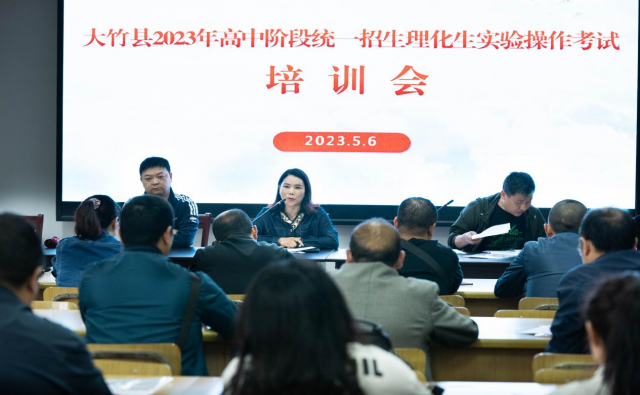 5月6日,大竹县2023年高中阶段统一招生实验操作考试培训会在大竹中学莲印校区实验楼召开。全县抽调监考教师及工作人员共80余人参加本次会议,会议由电教技装中心党支部副书记袁岸松主持。