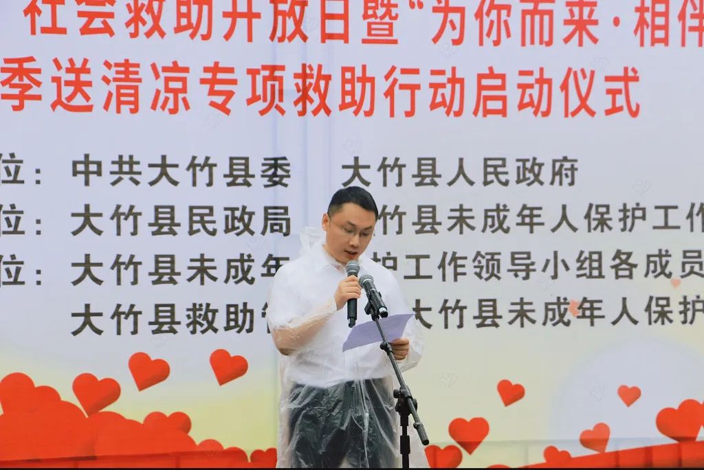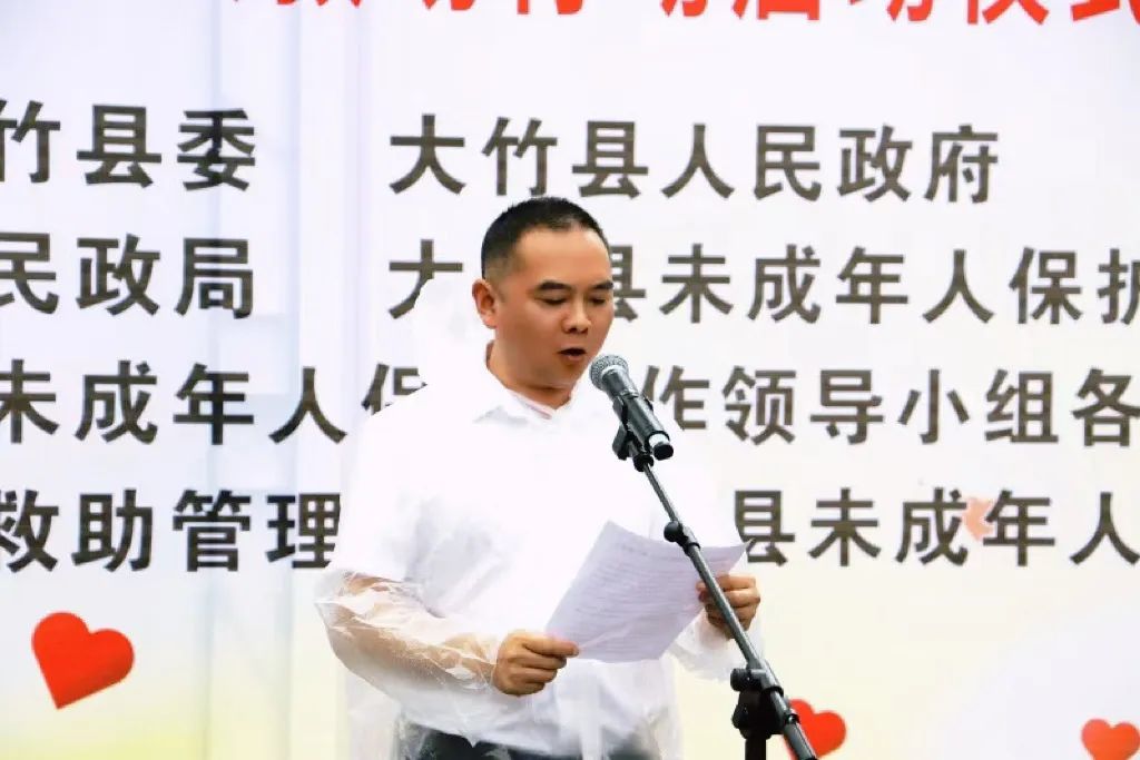 大竹县委常委、组织部部长李波为启动仪式致辞,指出社会救助和未成年人保护工作是社会发展的重要组成部分,责任重大、使命光荣,需要全社会的共同关注、支持以及参与;希望通过此次活动,能够进一步加深公众对社会救助和未成年人保护政策的了解,提高全社会对未成年人保护工作的认知度和参与度,营造全社会关心爱护未成年人的良好氛围。