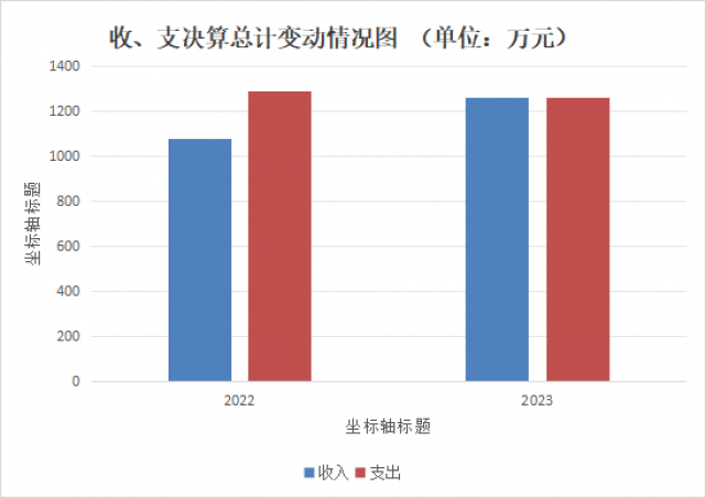 2023年度收、支总计均为1262.48万元。与2022年度相比,收入总计增加185.65万元,增长17.24%,支出总计减少30.24万元,下降2.8%。主要变动原因是2023年缩减政府开支。